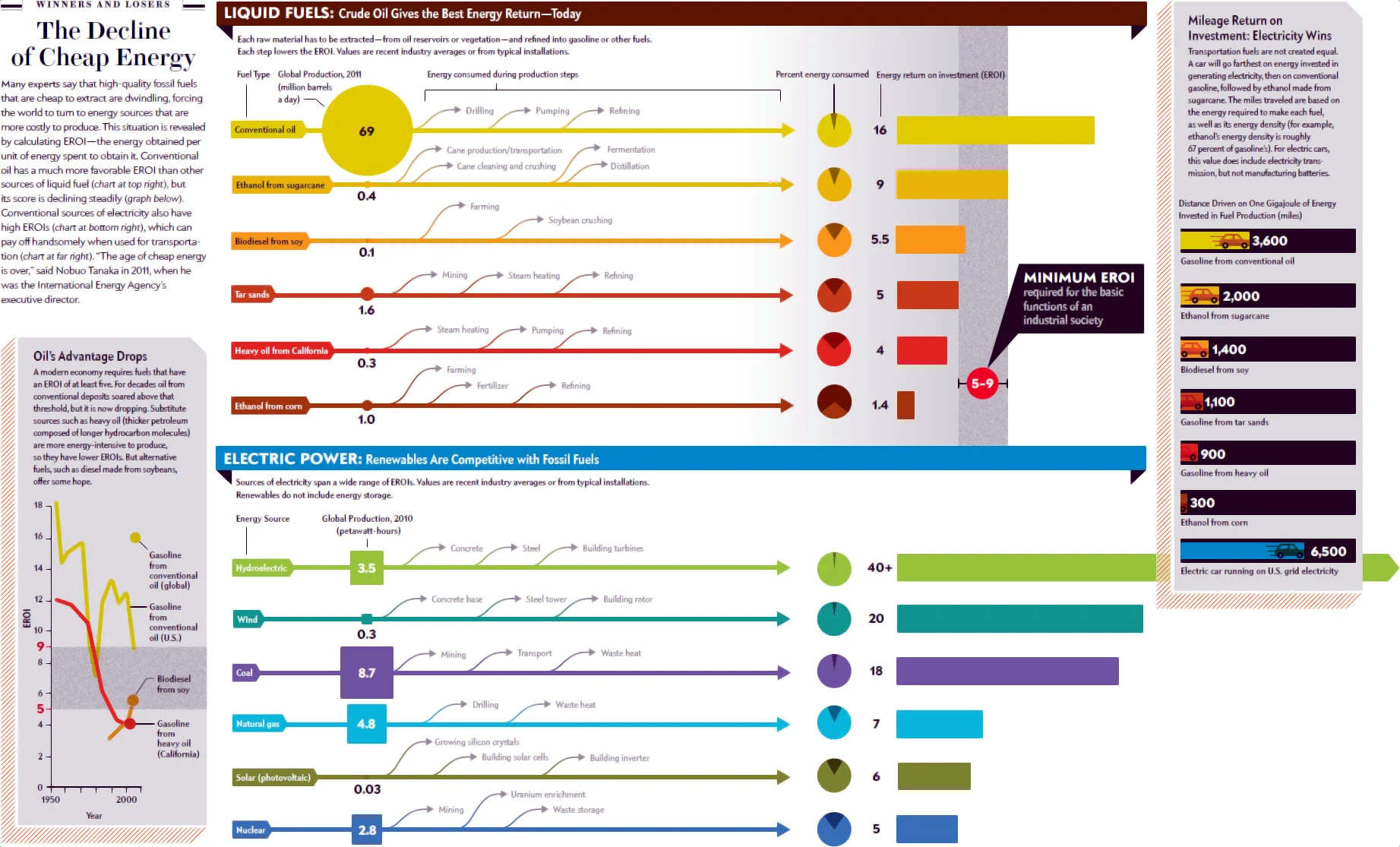 Charles A. S. Hall has created a measure called the "energy return on investment" (EROI). A decline in energy returns would eventually cause the closure of mines and industries, adversely affect agriculture, leading to a brutal drop in living standards.